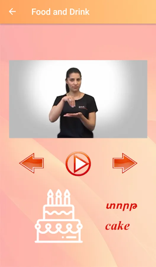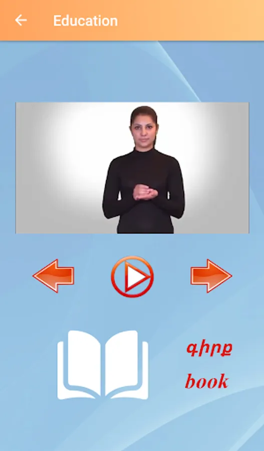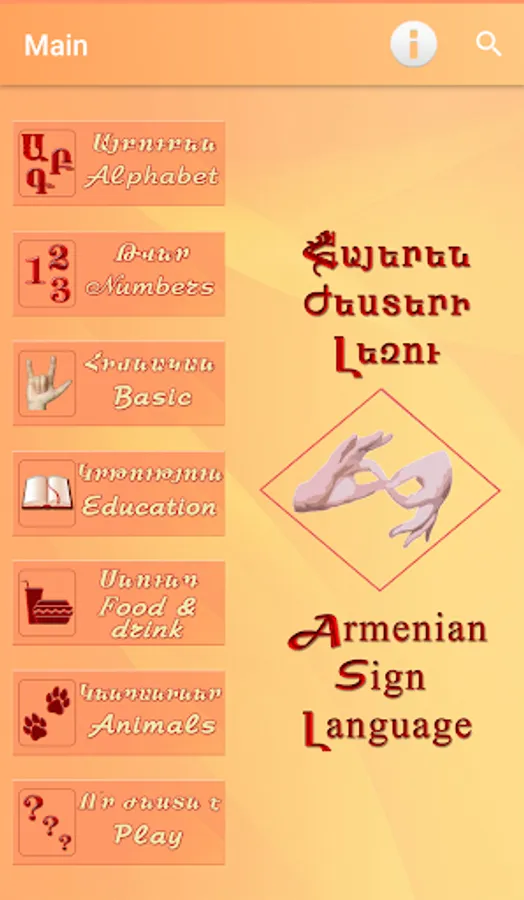 The program is simple and available enough, it is prepared for English and Armenian language users, without age limited. In separate sections are differed the topics. The Alphabet and numbers are shown by their appropriate gesture pictures, other gesture are shown by video with English and Armenian names. For checking working knowledge, the game part is separated, the knowledge of Armenian gestures, giving points for right answers. We also edit Search field for finding necessary gesture.