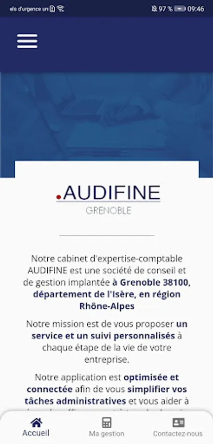 Our firm AUDIFINE is an accounting firm based in GRENOBLE in the department of Isère (38), and operates in the accounting and management of companies in all sectors of activity.