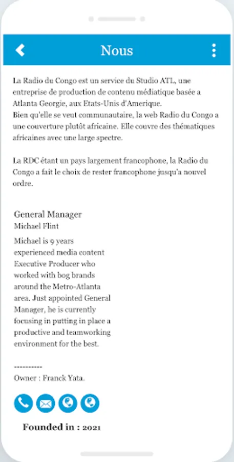 La Radio du Congo est un service du Studio ATL, une entreprise de production de contenu médiatique basée a Atlanta Georgie, aux Etats-Unis d'Amerique.