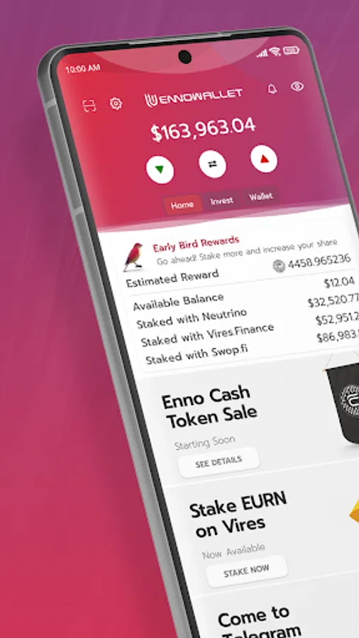 Staking and unstaking is super easy within a few clicks. The staking mechanism in Enno Wallet is Decentralized. It's governed by a smart contract, not by a centralized authority. Hedge your funds against market volatility. Stablecoins are stable in price. Smart contracts we use in Enno Wallet are verified by an independent audit