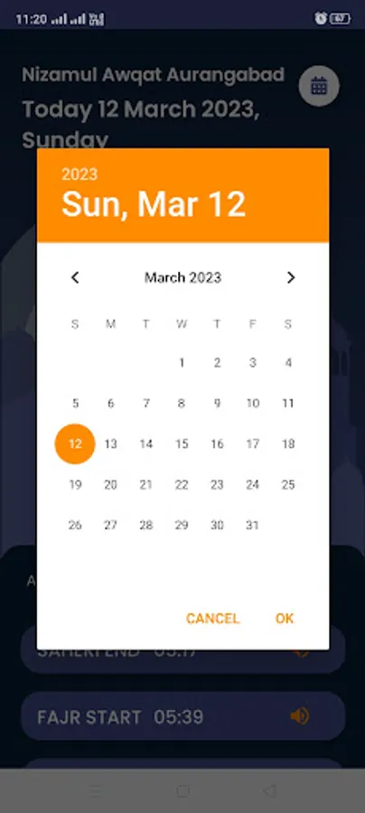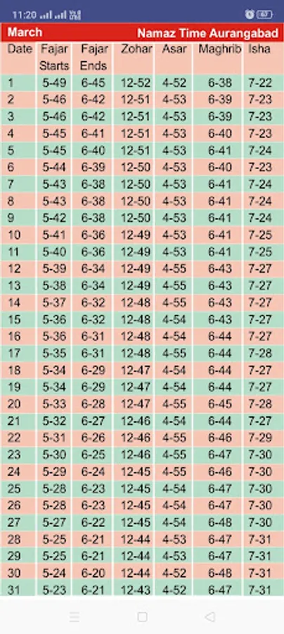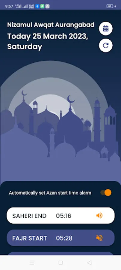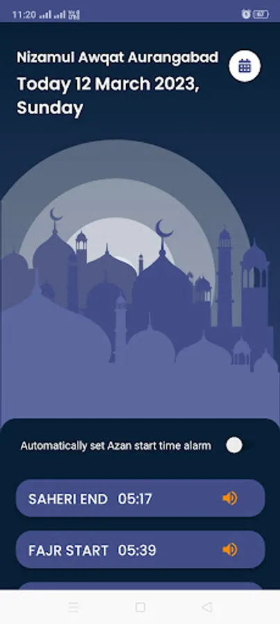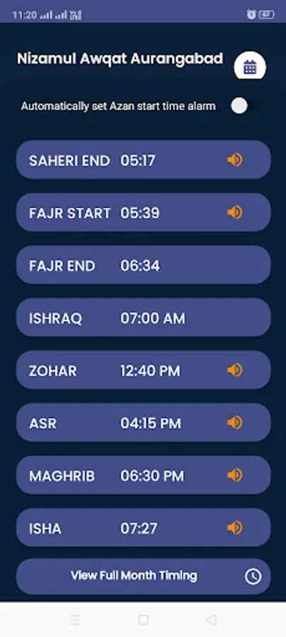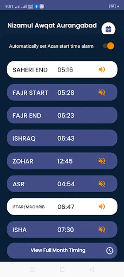 Azan (Adhan time, Salat time, Namaz time, Prayer time) Time table showing timing for Muslim and Alarm setup for all prayers.