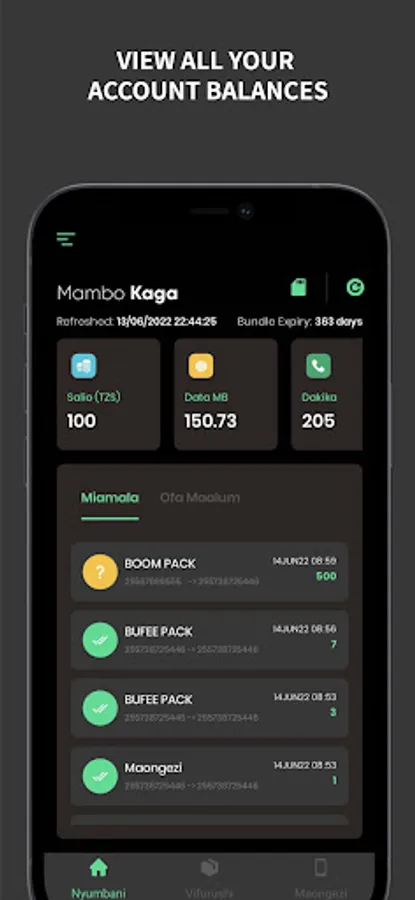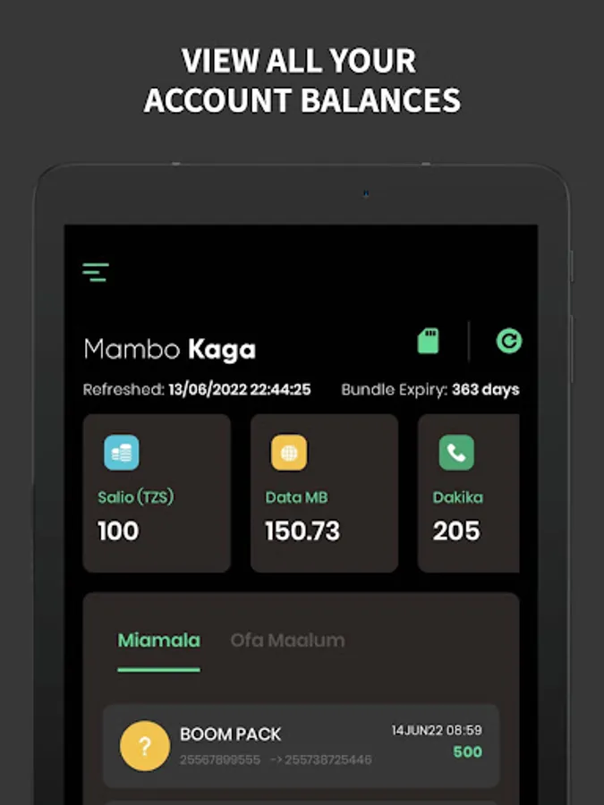 View all your TTCL Balances 24/7 - This includes Internet (MB), Minutes, and SMSes.