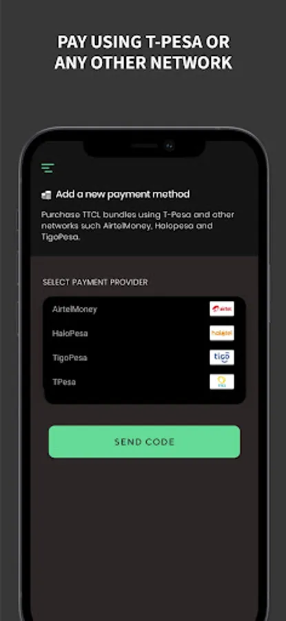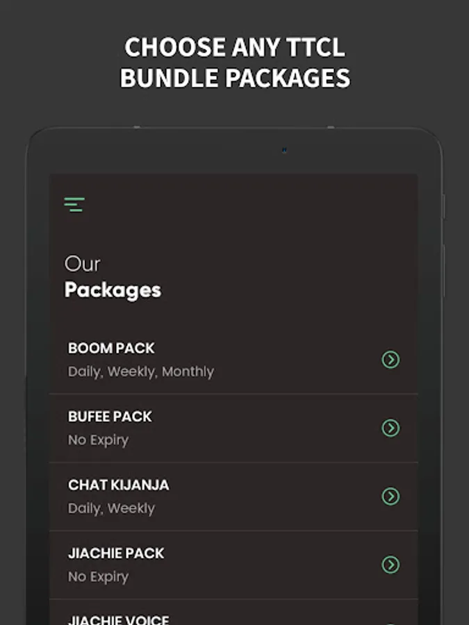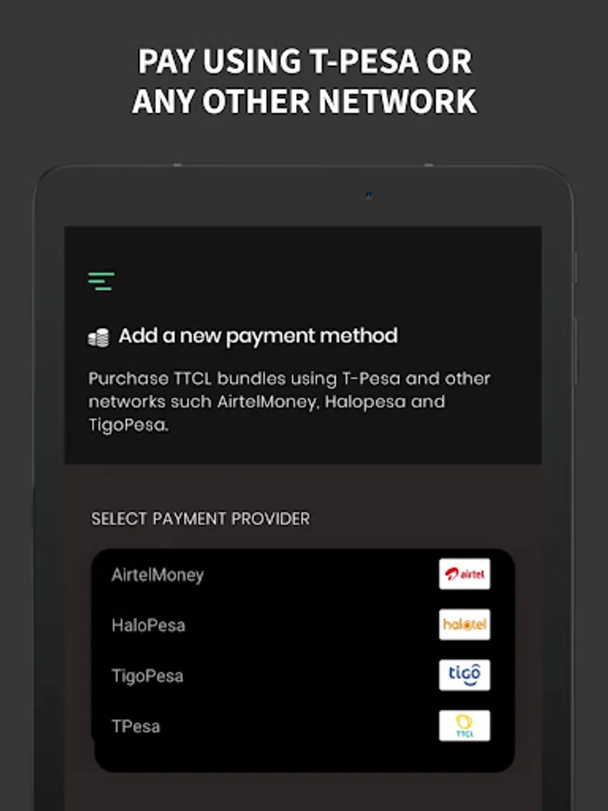 Bando allows you to buy any TTCL bundle that you want and pay using any mobile money payment method you have like TigoPesa, AirtelMoney, T-Pesa and Halopesa. It works even when you do not have DATA/MB.