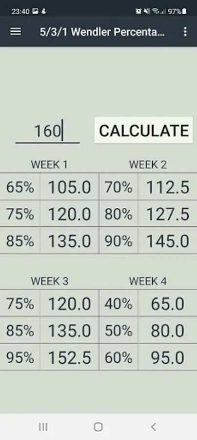 4) Wendler (5/3/1) Percentages: Calculates the weights you'll lift during the Wendler 5/3/1 workout program.