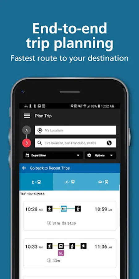 -Plan your entire end to end trip with BART’s exclusive Trip Planner giving you the fastest route from your starting point to your destination using BART and multiple modes of transportation, including connecting transit, biking, walking and driving.