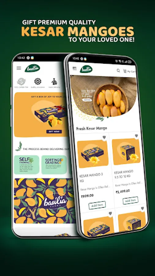 Basilia Farms is an online store to serve you the best quality fresh Kesar Mangoes . We at Basilia Farms are producer, processor & exporter of fresh fruits and vegetables . Download the Basilia Farms app to access multiple safe payment gateway options, offers and coupons on your orders.