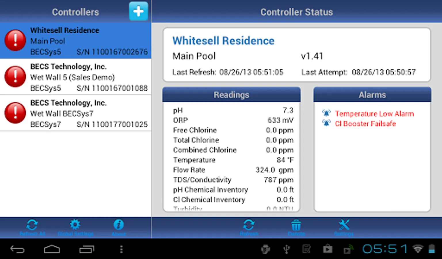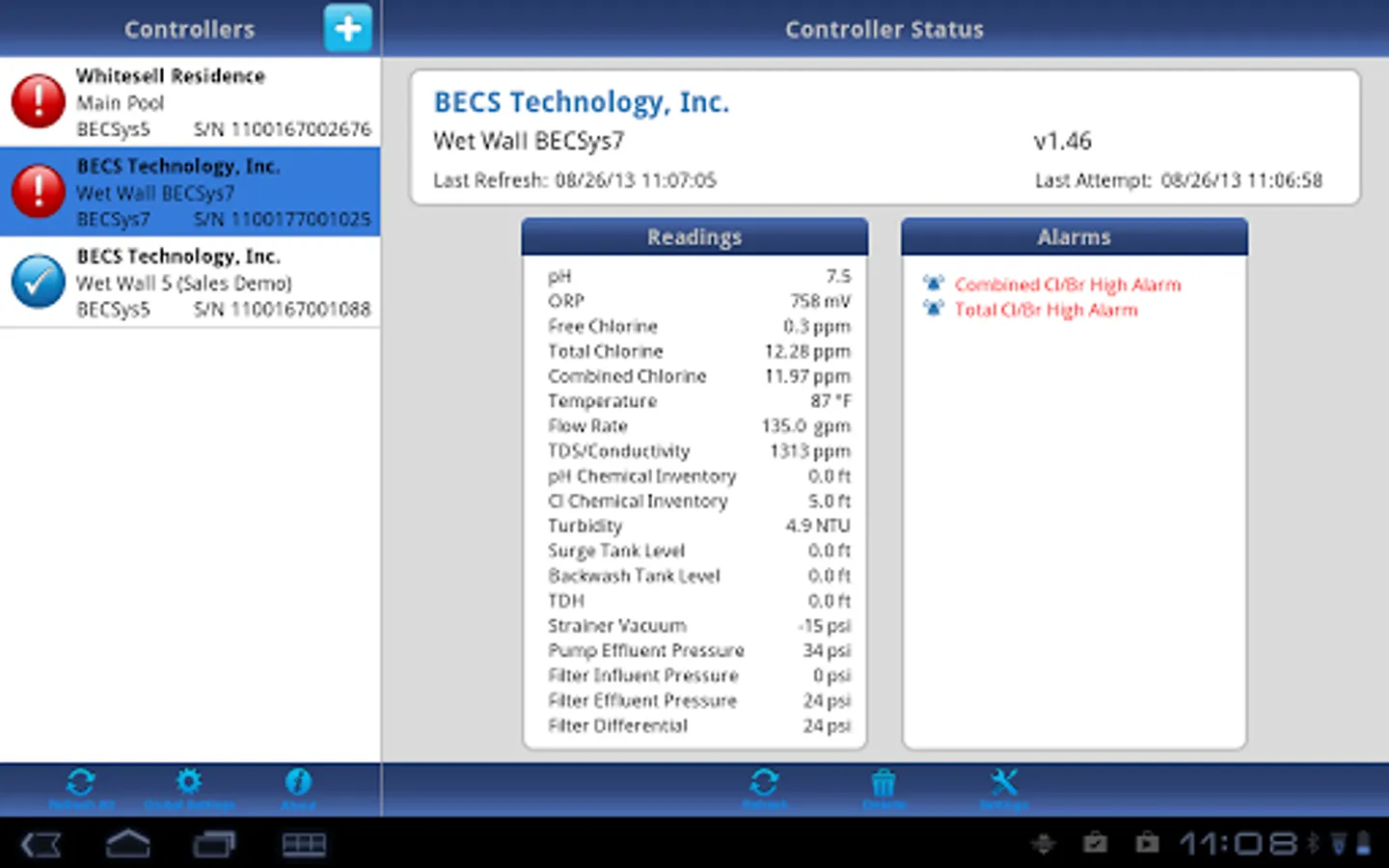 BECSys Now! provides an easy way for pool owners and operators to monitor the status of their BECSys Controllers 24/7. An unlimited number of BECSys controllers can be monitored using BECSys Now! The BECSys Now! App is compatible with BECSy5 and BECSys7 controllers with firmware v1.26 or higher. The BECSys Now! App is also compatible with BECSys3 and BECSys2 controllers connected to a BECSysRCM.