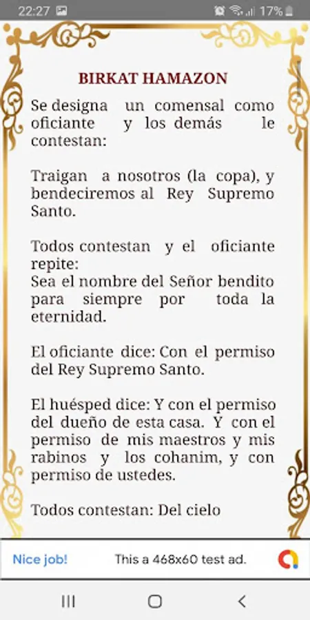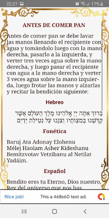 Are you in a restaurant, traveling, anywhere and do not have a sidur or birkon to bless before and after eating your food? no problem, here we have designed this application for you, because you must always have the obligation to bless as much as the need to have your mobile phone nearby. in it you will find birkat Hamazon, blessings for fruits of the tree, fruits of the earth, for the rainbow, thunder, prayer of the traveler, blessing for the lightning, for the aromas, and many others more typical of the Jewish law.
