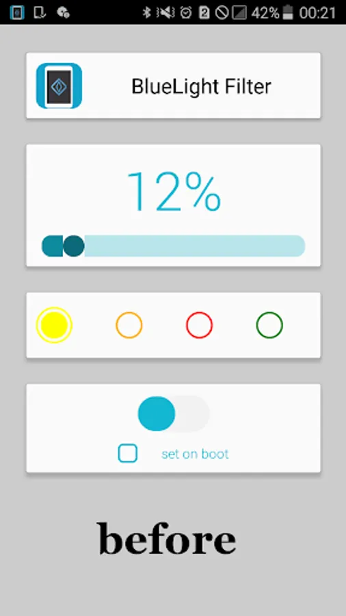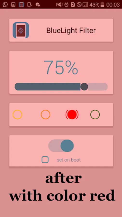 The twilight app makes your device screen adapt to the time of the day. It filters the flux of blue light emitted by your phone or tablet after sunset and protects your eyes with a soft and pleasant red filter. The filter intensity is smoothly adjusted to the sun cycle based on your local sunset and sunrise times.