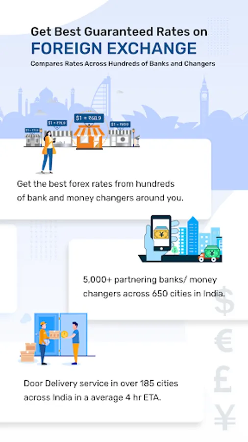 Currency exchange - Say goodbye to rate haggling when exchanging your foreign currency cash. Leverage India's largest forex marketplace to get the best forex rates around you from hundreds of money changers and banks in your area. Get free 4 hour door delivery or doorstep pickup for your forex cash and forex cards. Service in over 500 cities pan India.