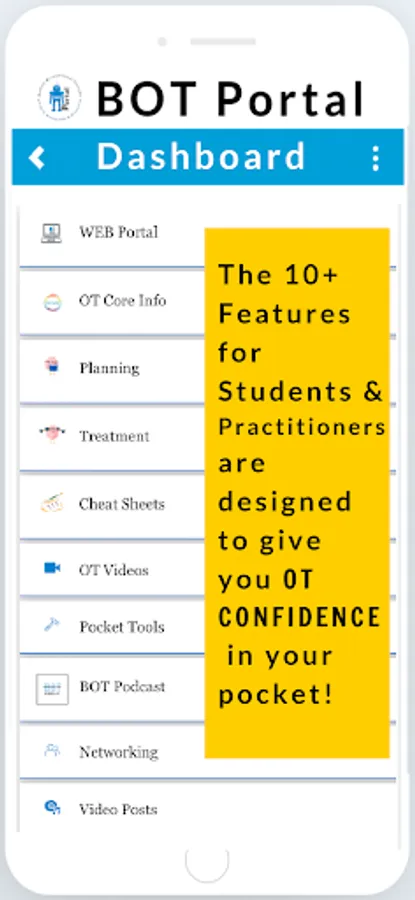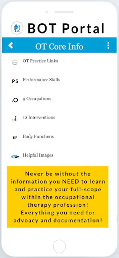 The BOT Portal app is an occupational therapy resource for students and practitioners looking for a quick access app for commonly used documents, information, and references.