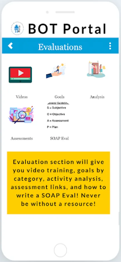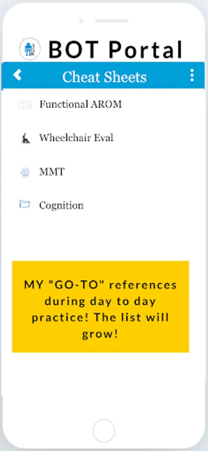 The resources provided by the BOT Portal app are a preview to the full web-based membership offered by the BOT OT mentorship and resource portal. For those students and practitioners looking for ongoing interaction and membership resources or CEU opportunities, web-based membership may be an option for you!