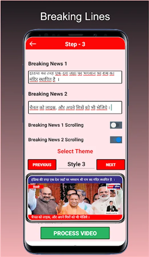Breaking News Maker has predesigned themes, and button to aloow scrolling line. here user have to type the content in breaking lines, selct your logo and your video is ready to share.