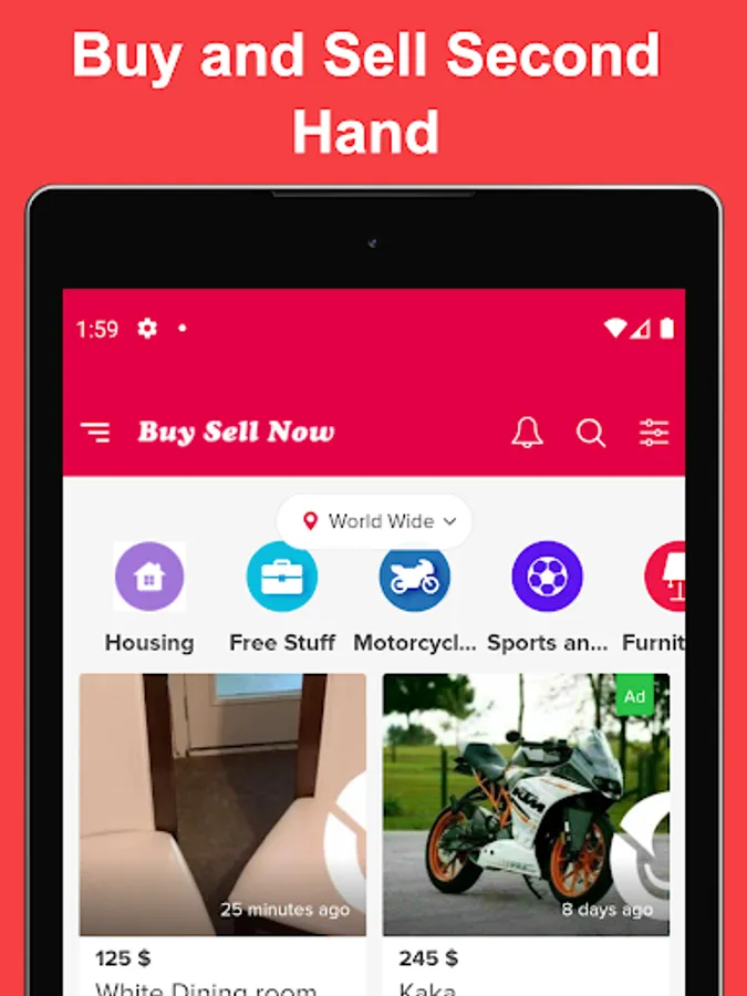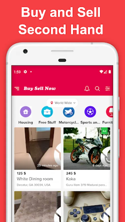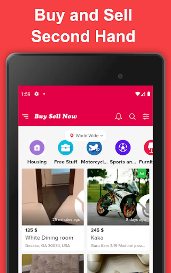 "Buy Sell Now" Best shopping app to letgo and buy and sell stuff locally. You can add homes for sale, cars for sale, property, electronics, used iphone, motorcycles, used fashion, buy pets, buy jewelry, used furniture for sale used games etc. a lot of used up items for sale by owner and buy electronic for cheap prices.