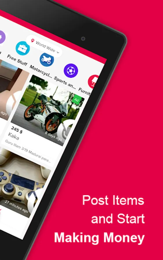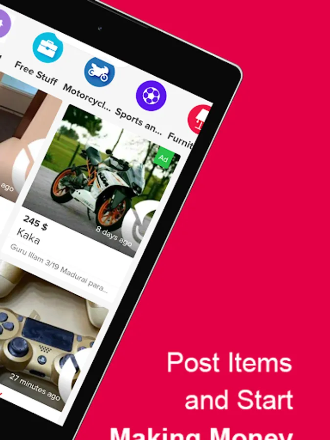 Sell bikes, furniture, car parts, mobile phones, tablets, Televisions, Game consoles, music players, speakers and other electronics instantly. And more categories…