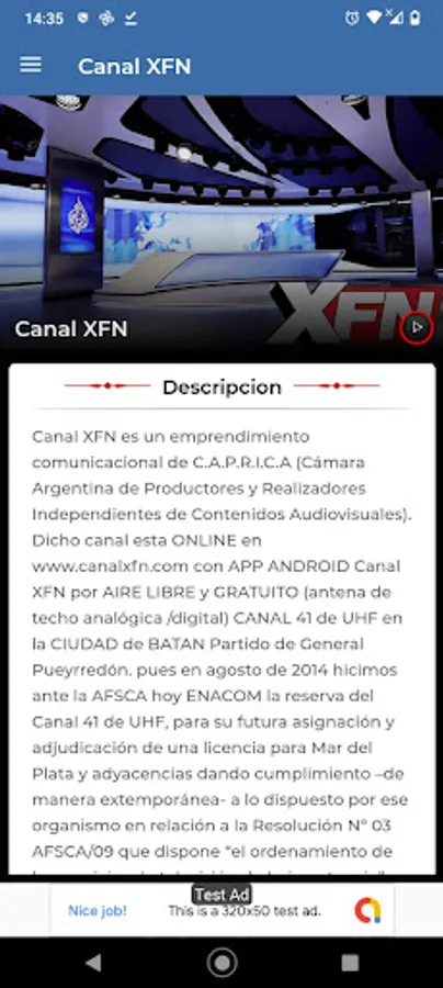 Said channel is ONLINE at www.canalxfn.com with ANDROID APP Channel XFN on OPEN AIR and FREE (analog/digital roof antenna) CHANNEL 41 of UHF in the CITY of BATAN Partido de General Pueyrredón. because in August 2014 we made the reservation of UHF Channel 41 before the AFSCA today ENACOM, for its future allocation and award of a license for Mar del Plata and its surroundings, complying -extemporaneously- with the provisions of that body in relation to Resolution No. 03 AFSCA/09, which establishes "the ordering of low-power television services", with the fancy name "XFN", a service that is operational in the town of MAR DEL PLATA, Province of Buenos Aires, in the frequency of the UHF Band: 632 – 638 MHz (Channel 41), allocated -on a primary basis-