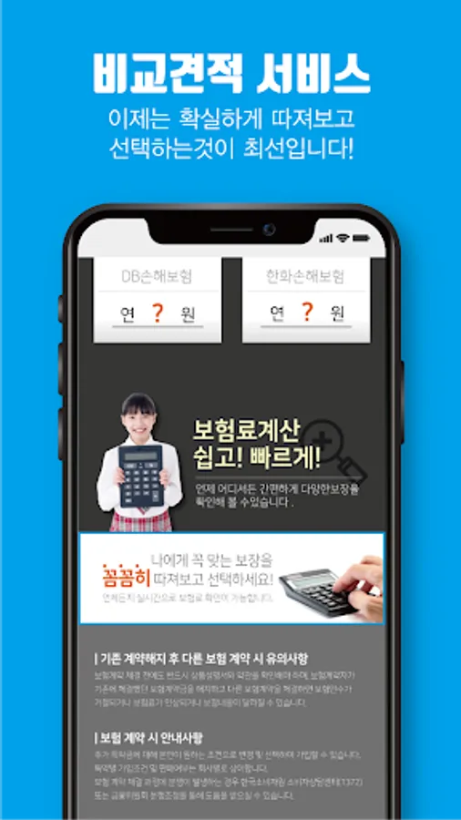 We will help you calculate your premium by comparing the insurance products of major domestic insurance companies accurately and quickly. Auto insurance premiums can vary considerably depending on the insurance company and how the insurance premiums are set. You should consider whether you have too many useless riders, or if you are a required rider and have missed out on an accident. The above application guides you to solve these difficulties easily.