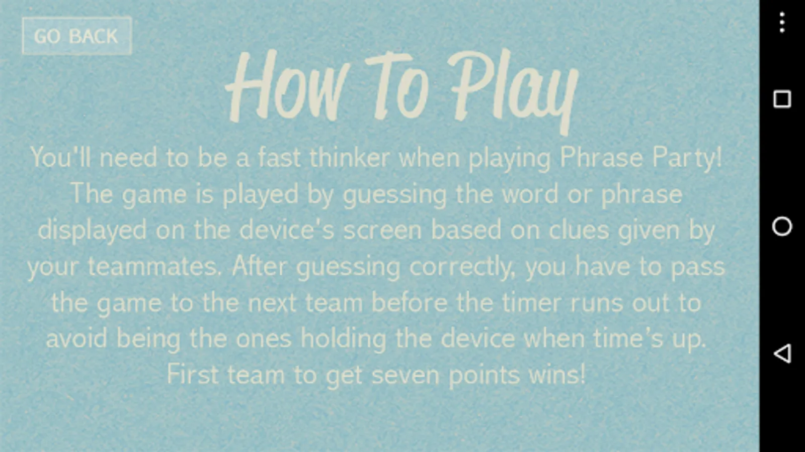 You'll need to be a fast thinker when playing Phrase Party. The game is played by guessing the word or phrase displayed on the device's screen based on clues given by your teammates. After guessing correctly, you have to pass the game to the next team before the timer runs out to avoid being the ones holding the device when time’s up. First team to get seven points wins!