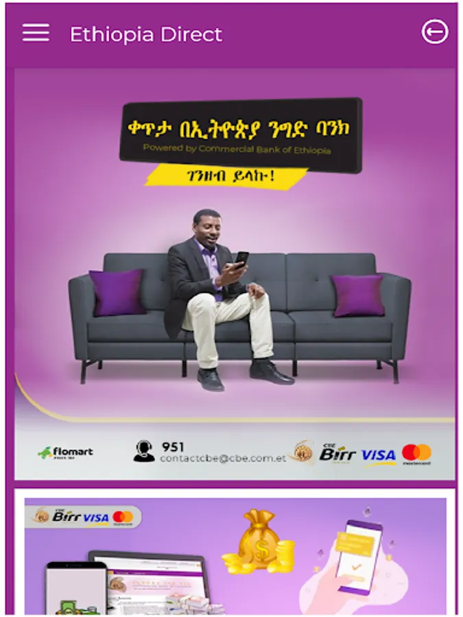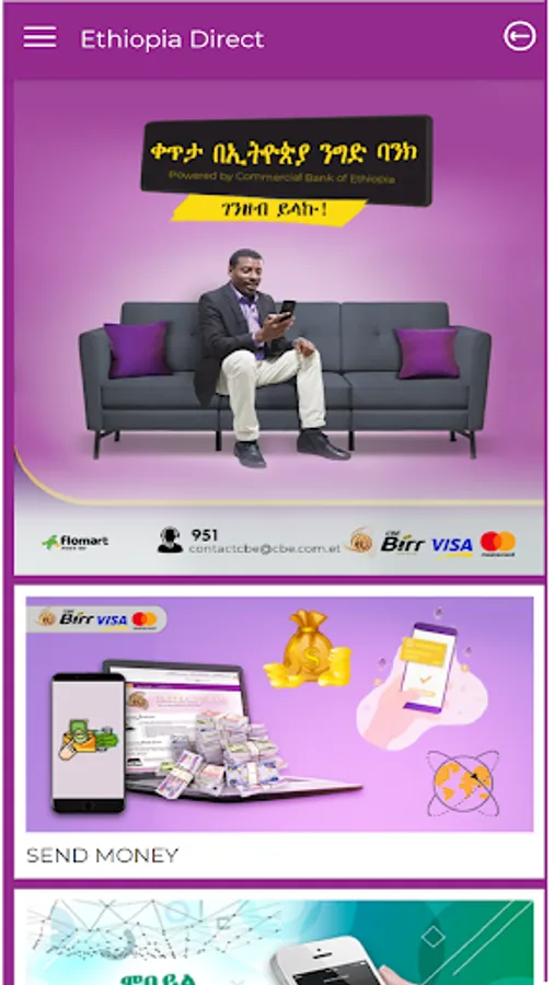 Ethiopia Direct by CBE is a service from Commercial Bank of Ethiopia for the Ethiopian Diaspora. The app allows you to send money directly to a CBE account or mobile wallet, make bill payments, buy airtime, order food delivery, essential groceries and more. Ethiopia Direct is the new service that connects you with your loved ones and simplifies the way you support families and friends back home.