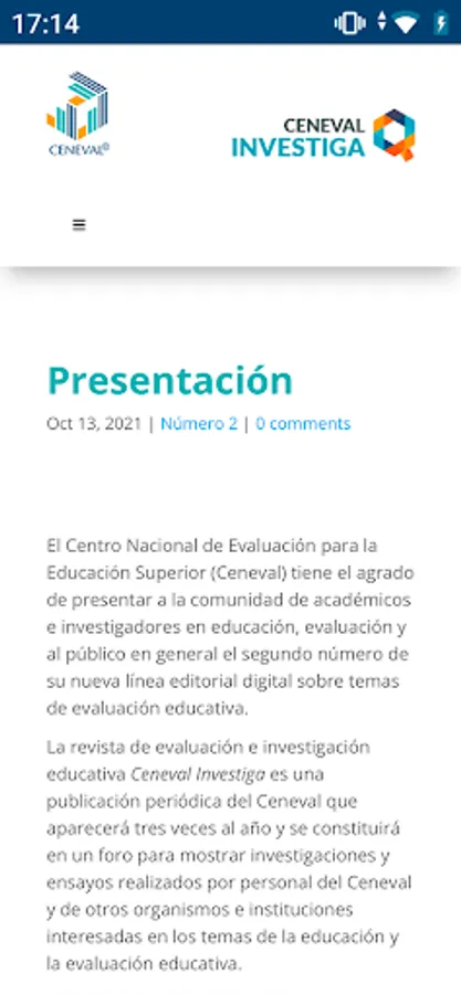 The National Center for Evaluation for Higher Education (Ceneval) presents to the community of academics and researchers in education, evaluation and to the public the digital magazine specialized in educational evaluation and research issues. Ceneval Investiga, whose periodicity is four months, seeks to become a forum to show research and tests carried out by staff of the Center and other institutions and organizations interested in said topics.