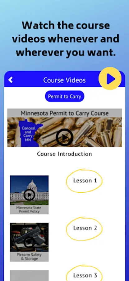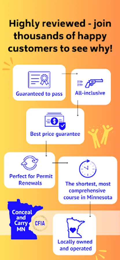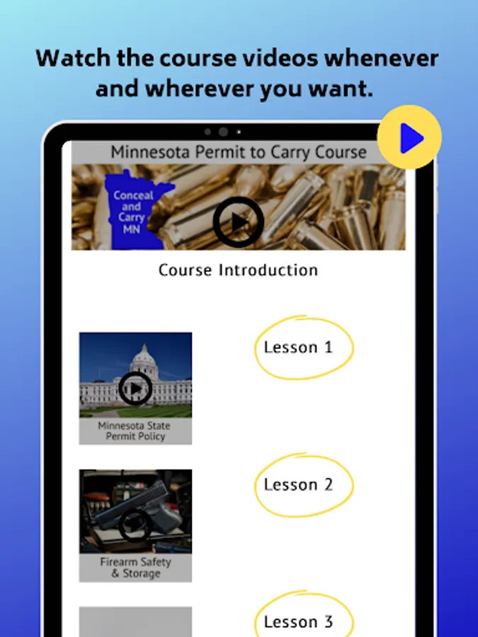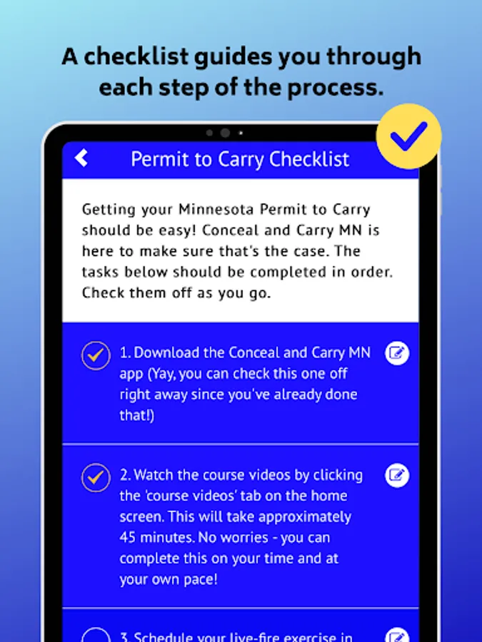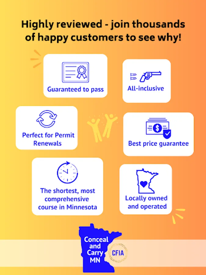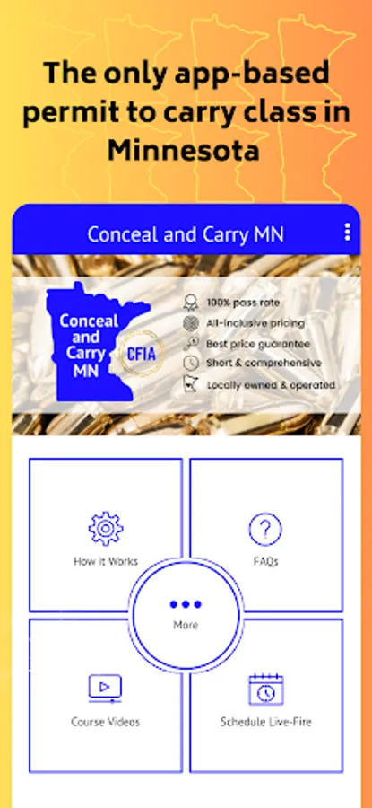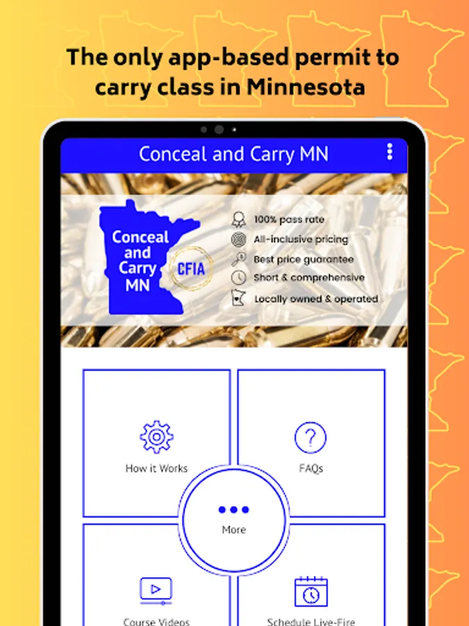 Conceal and Carry MN is an all-in-one FREE app that allows customers to complete the required training and schedule their in-person live-fire exercise. You only pay if you schedule a live-fire exercise. Upon successful completion of the training course and live-fire exercise, students receive a certificate of completion. Students may then apply for a Minnesota Permit to Carry.