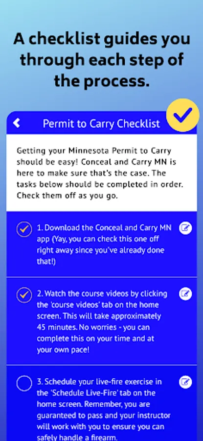 Full access to the app remains even after your permit to carry is obtained, making it a valuable tool to refer to and stay up to date on current state statutes and laws.
