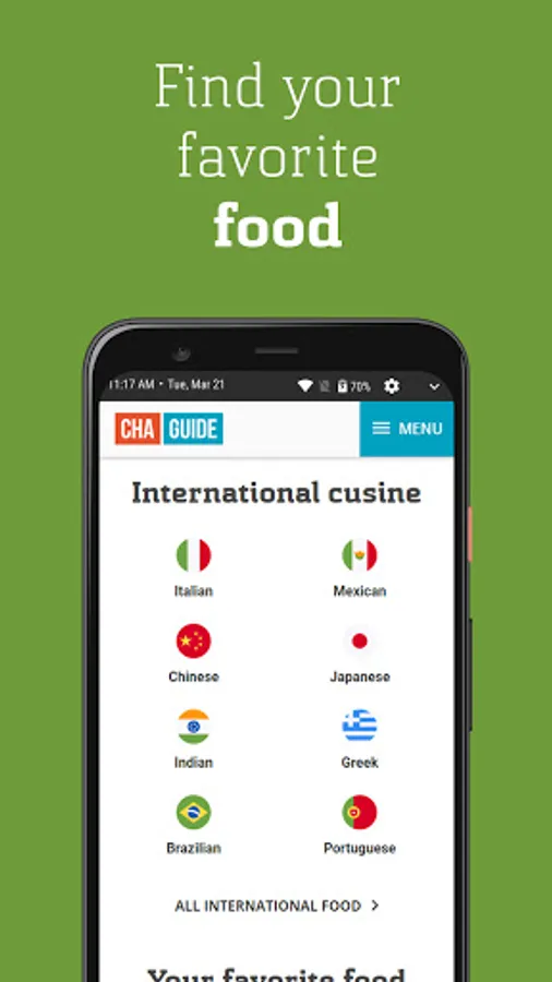 - international cuisine (Italian, Mexican, Chinese, Greek, etc.)