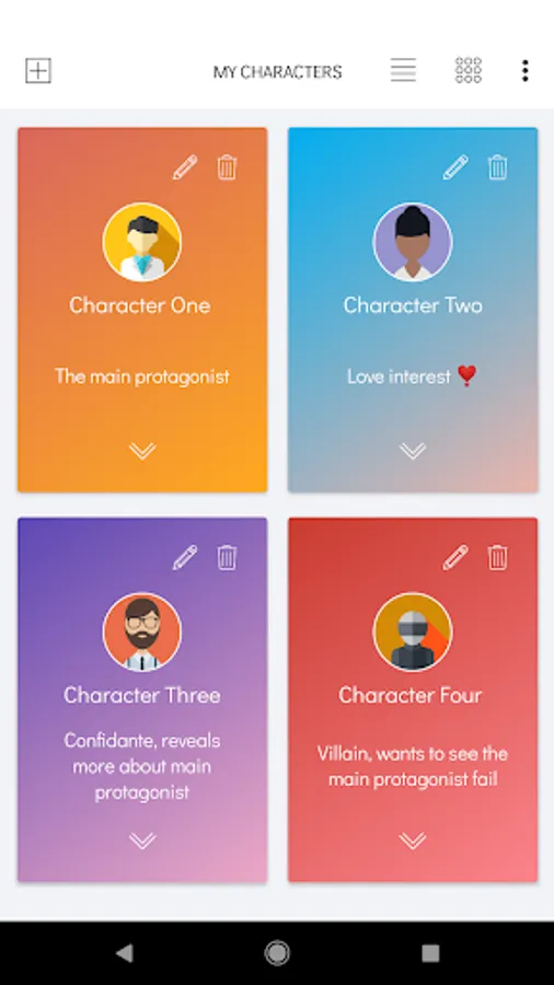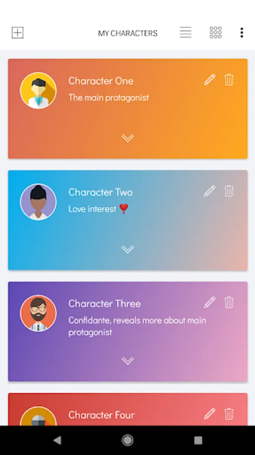 * Enter details and characteristics for all your characters, upload photos, add avatars and add links for each character card. Edit and save at any time.
