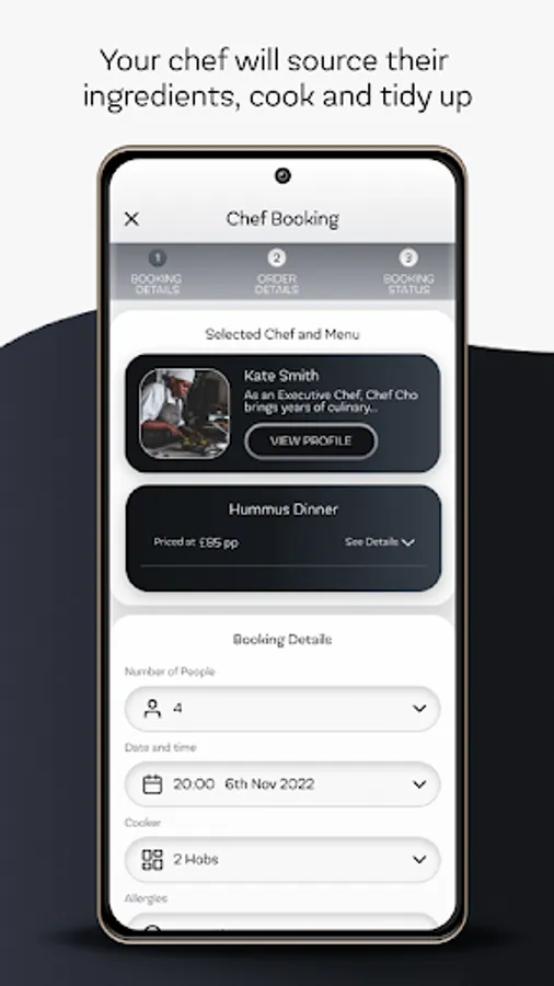 - Your chef will bring all of the ingredients, cook for you and tidy up while you sit back and enjoy your evening.