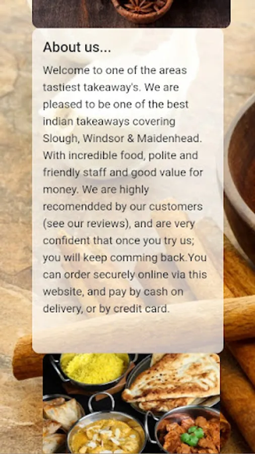 Welcome to one of the areas tastiest takeaway's. We are pleased to be one of the best Indian takeaways covering Slough, Windsor & Maidenhead. With incredible food, polite and friendly staff and good value for money. We are highly recommended by our customers (see our reviews), and are very confident that once you try us; you will keep coming back.