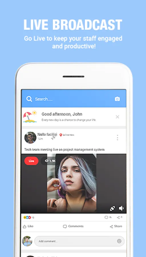 - Go Live - Live stream engagement with the entire organization or team from anywhere to get instant reactions.