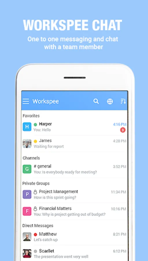 - Workspee Chat - Stay in the loop by having a central space for conversations, files, photos, videos, gifs etc.
