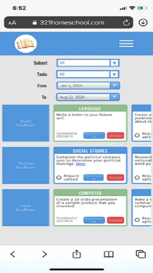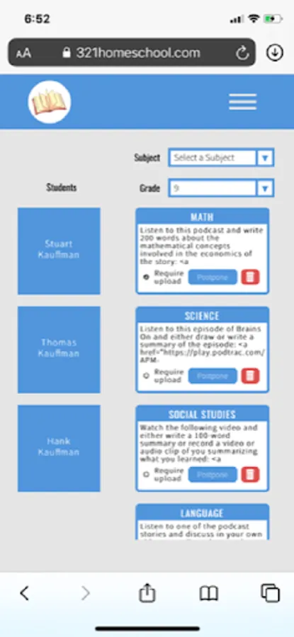 This app will allow you to assign a full curriculum of educational projects to your kids or students in just 5 minutes. Just click and drag any of our 10,000 free, self-directed project ideas covering every grade and subject to your students, then track their progress as they complete each day's assignments. For busy parents this is the ultimate homeschool solution! "321Homeschool is the app designed as a complete solution for parent/teacher assigned, self-contained daily curriculum for homeschoolers.