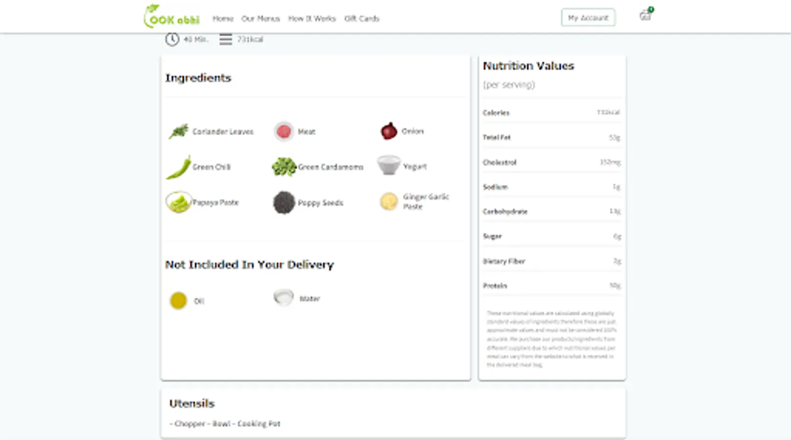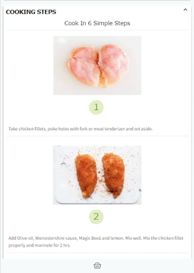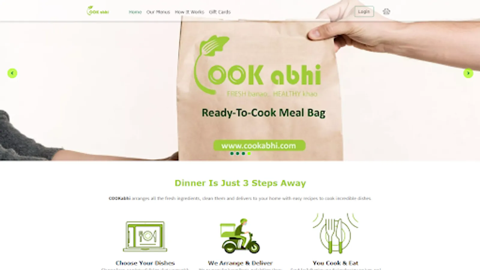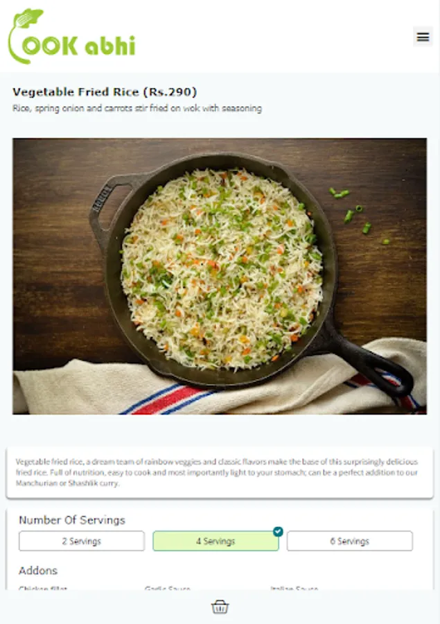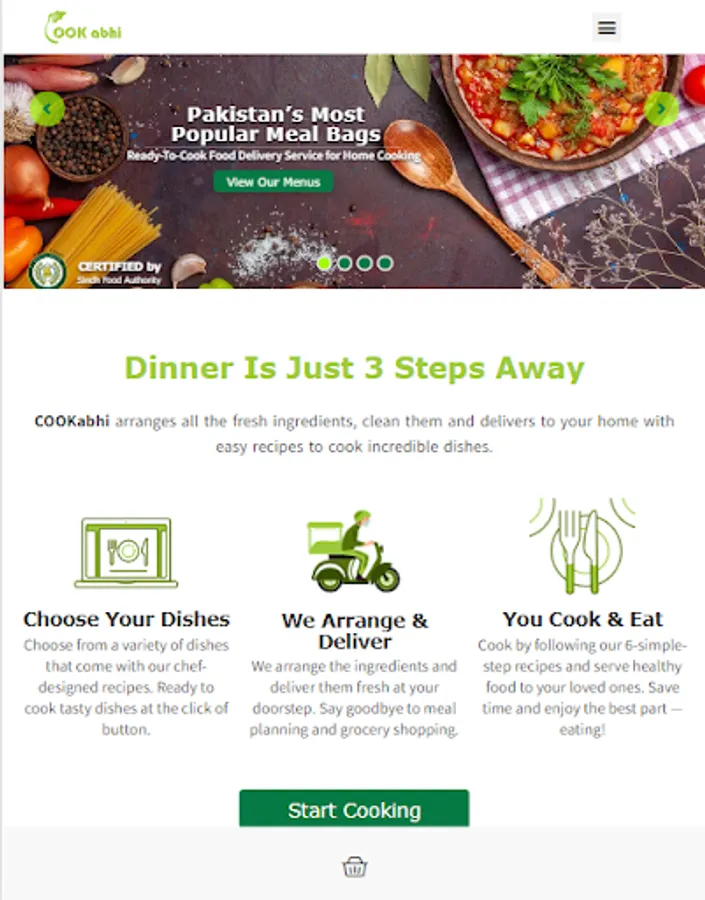 We provide you all the ingredients, clean and fresh, packed in a bag to cook delicious and hygienic food in 6-simple steps. Select recipes of your choice from our weekly menu page and place order. You will get all the ingredients of selected recipes including meat, veggies, sauces, masala etc. along with a recipe-card. Each recipe consists of 6-simple cooking steps. Cook the provided ingredients following these steps to serve your family, yummy and healthy food cooked by your own hands because doctors say: 'Health is guaranteed only when you cook it at home' :)