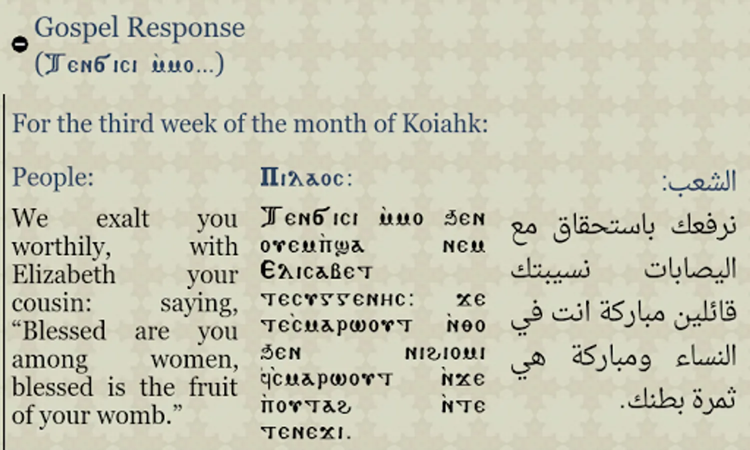 Coptic Reader can generate documents in a combination of English, Arabic, and Coptic and supports both English and Arabic as the application interface language. Coptic Reader is fully customizable and allows you to show/hide different liturgical roles (i.e., Priest, Deacon, and Congregation), inaudible prayers, rubrics/comments, and languages.