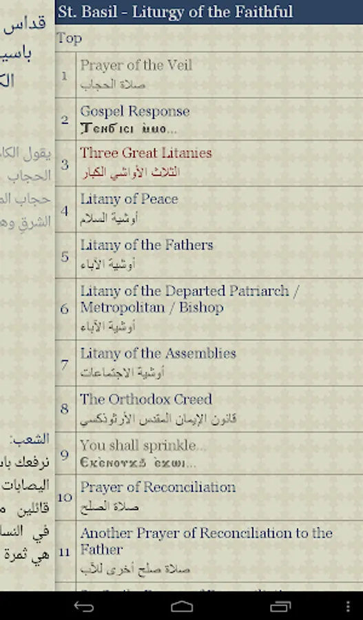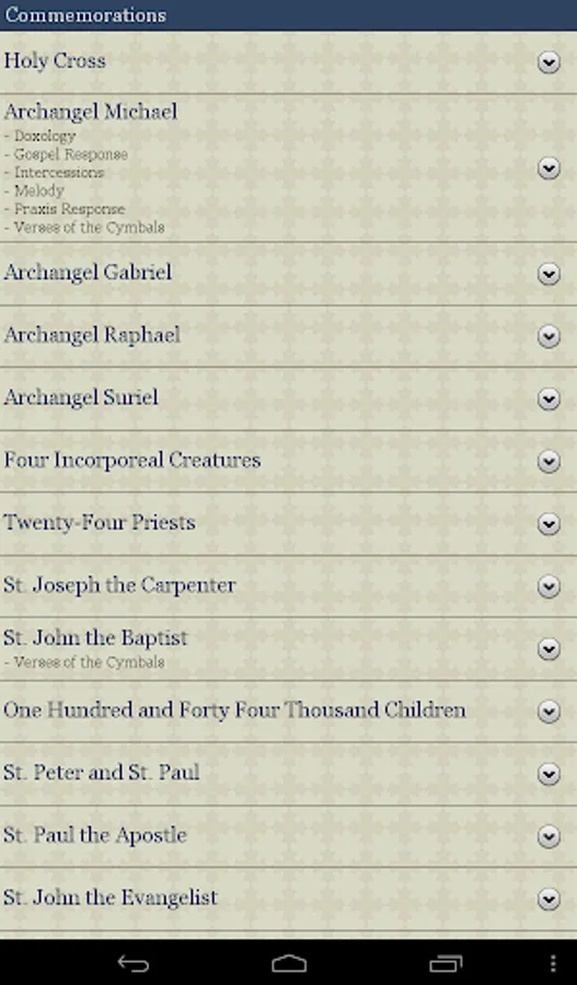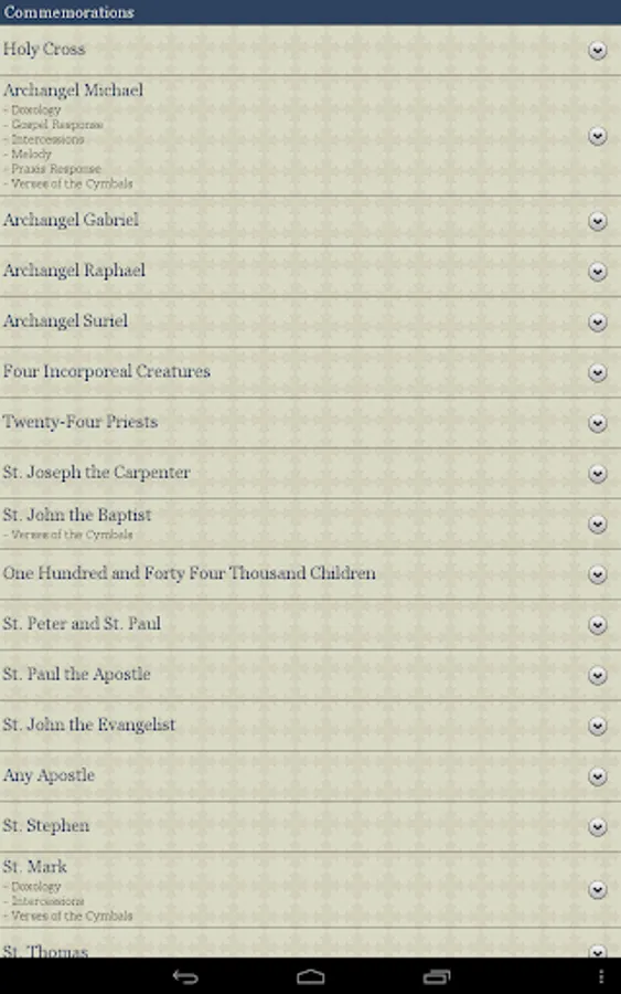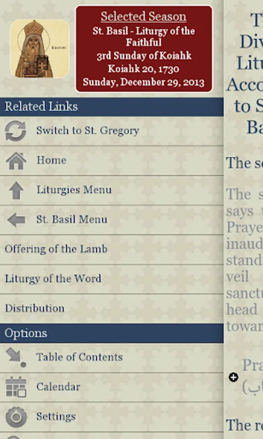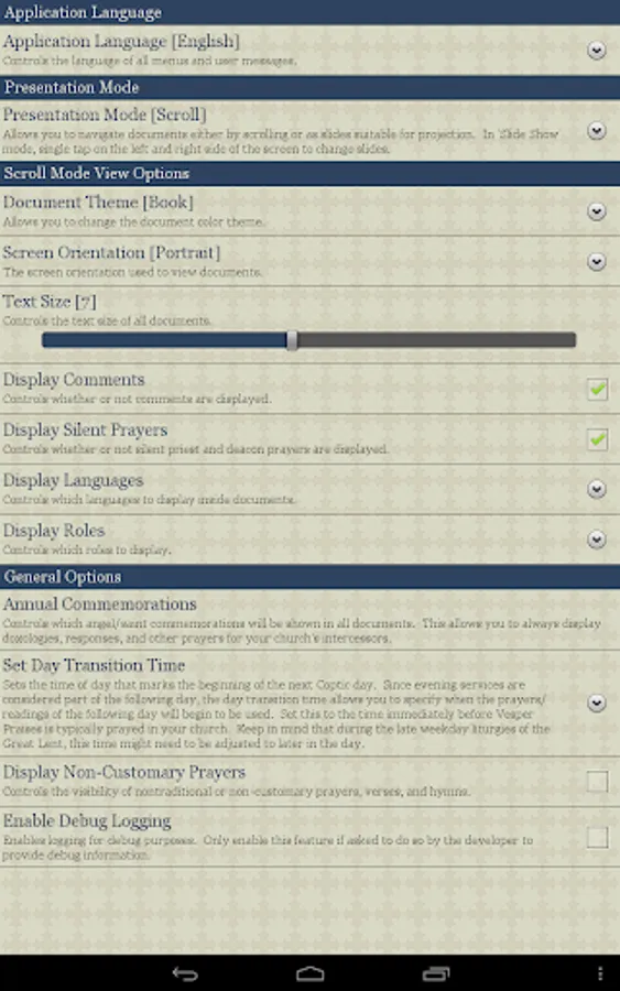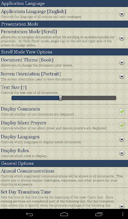 You may choose between different graphical themes as well as change the document text size. A presentation mode is also supported that allows you to project the content in your church for a complete experience. The application also allows you to control which saint or archangel commemorations will be shown in doxologies, hymns, responses, and other prayers for your church's intercessors.