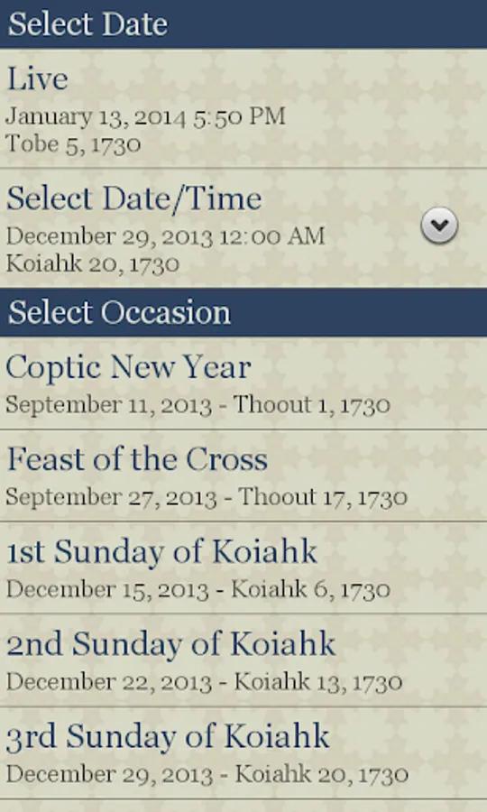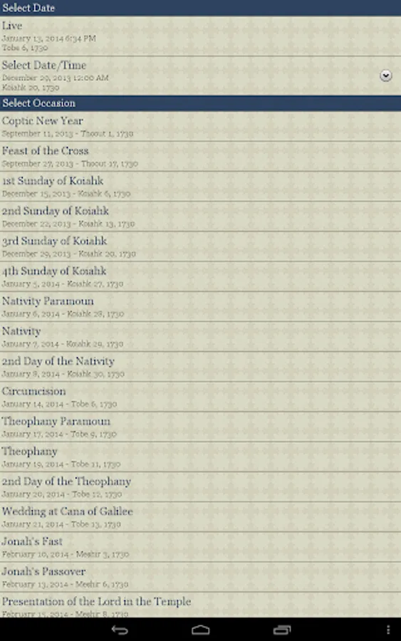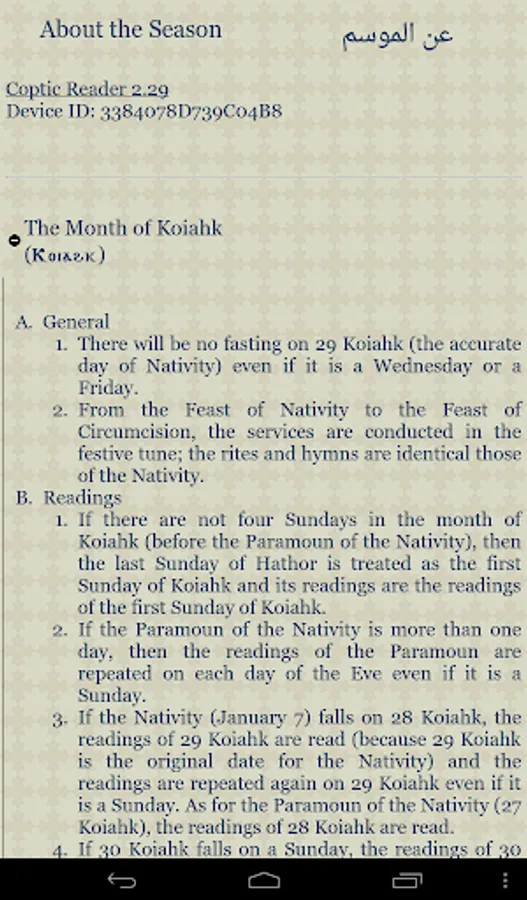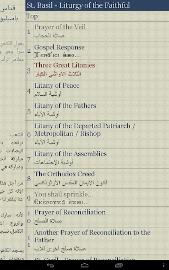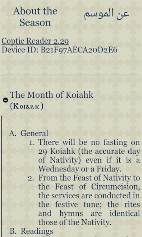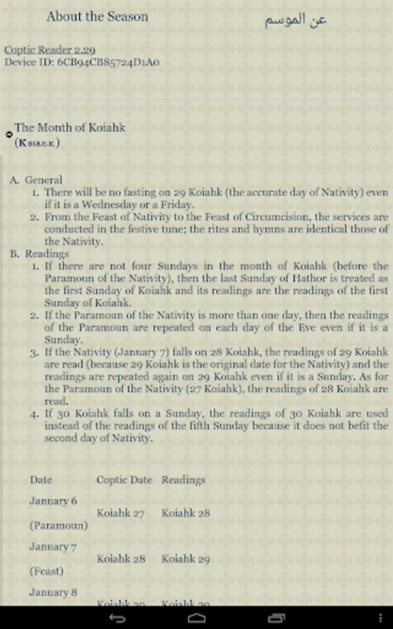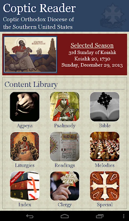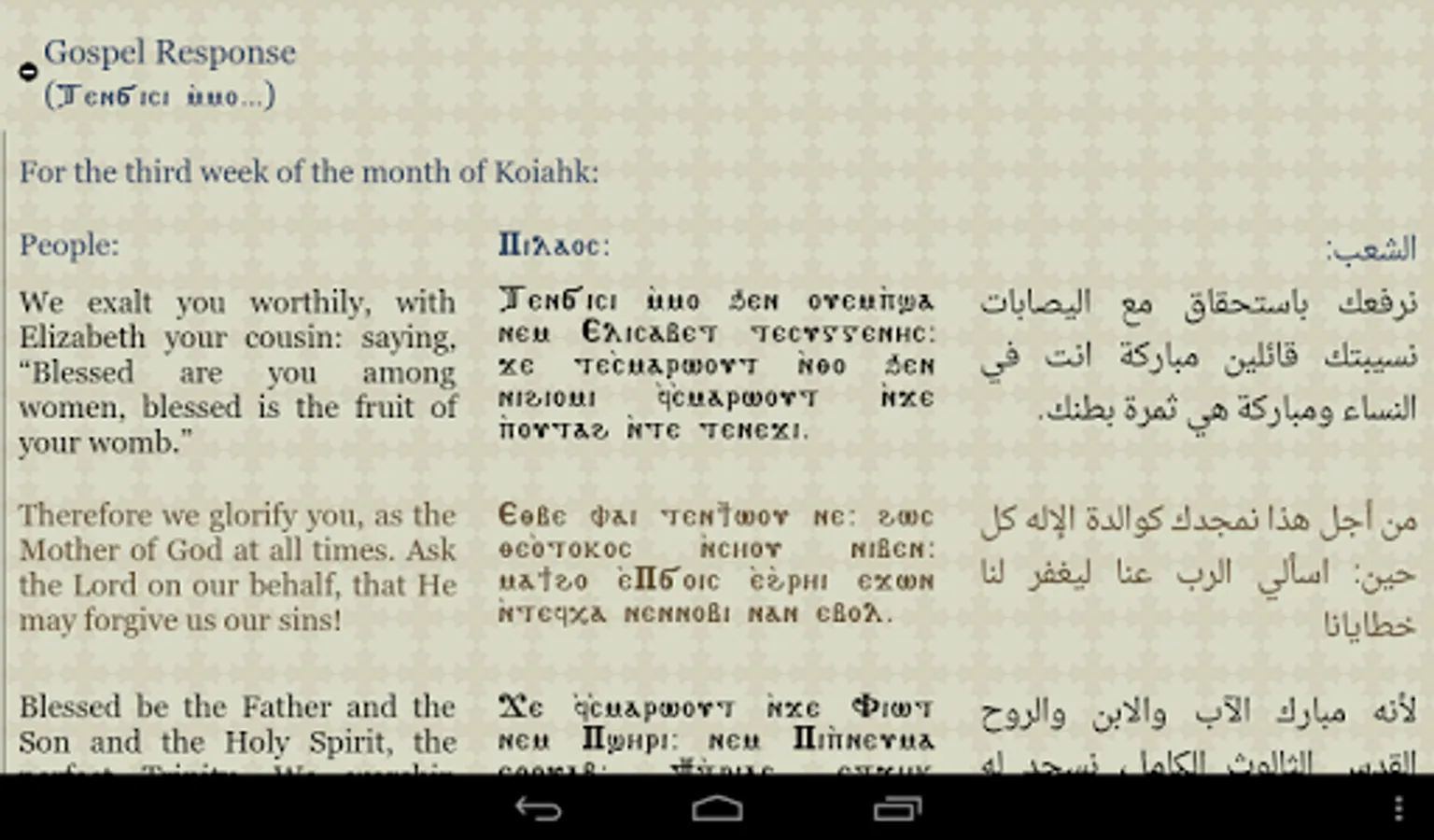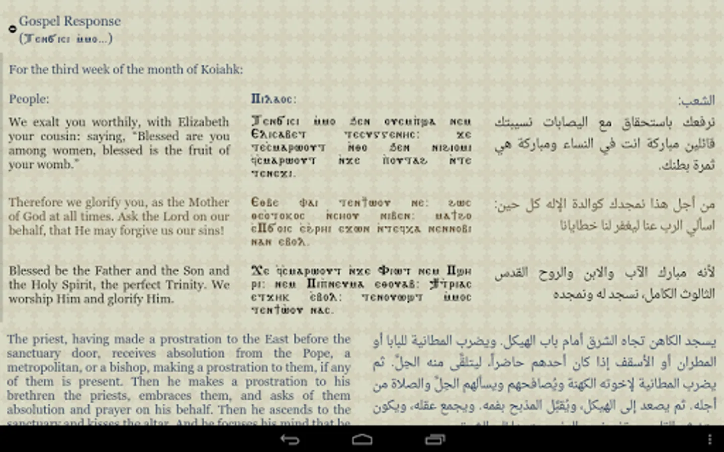 Coptic Reader is a mobile application that contains the liturgical text, rites, psalmodies, hymns, melodies, services, and sacraments of the Coptic Orthodox Church. See below for a full list of included content. Coptic Reader is not simply a text reader but rather it dynamically creates each document/service according to the rites of the current day, or selected day/feast. Coptic Reader builds each document on the fly with all appropriate hymns, rites and instructions to take the guess work out of the order of a church service.