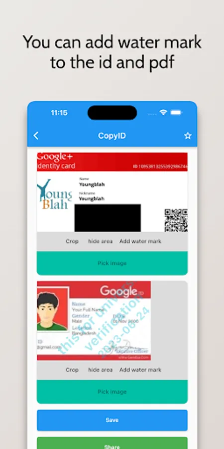 2. **Sharing Watermarked ID Cards as PDF:** Head to the Share tab to share your watermarked ID cards. Select the desired card from your collection and tap the Share as PDF option. You'll have various sharing methods to choose from, such as email, messaging apps, or other platforms. The watermarked ID card will be converted to a PDF, ensuring compatibility and maintaining security during sharing.