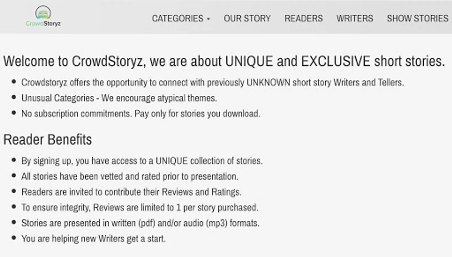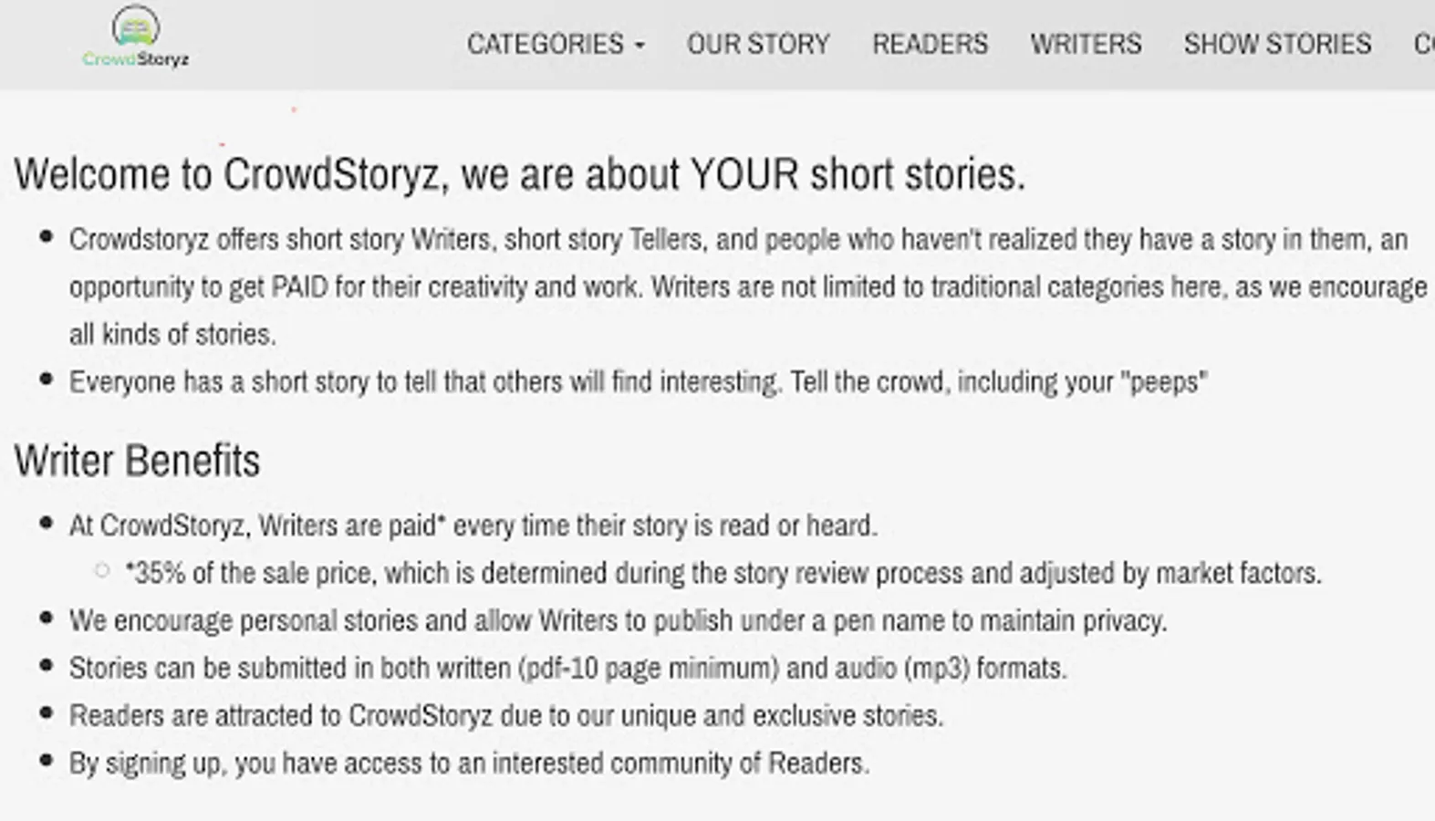 By submitting a story for consideration, you are giving CrowdStoryz a 1 year commitment to exclusively market and sell downloads of the story. CrowdStoryz reviews all stories and reserves the right to refuse any stories.