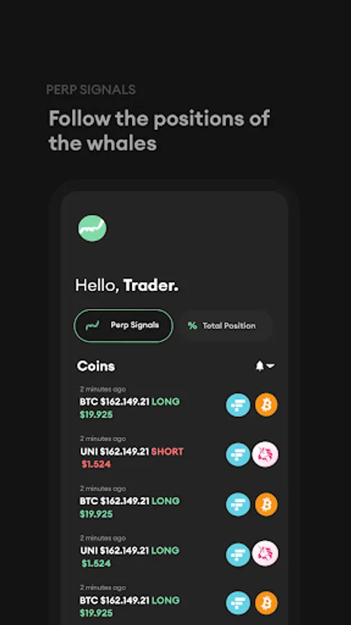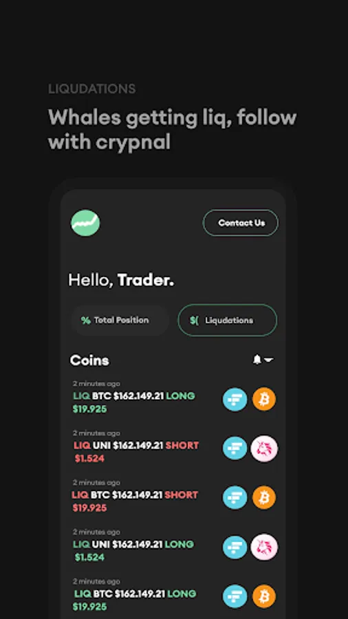 You can track the trades, liquidations and total positions with Crypnal anytime, anywhere you want.