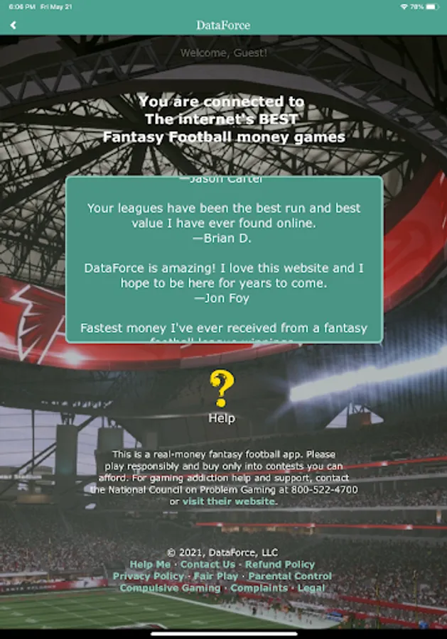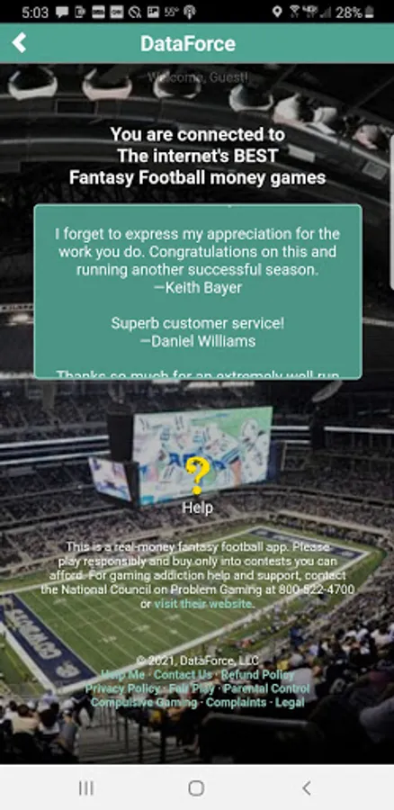 This is a real-money fantasy football app. Please play responsibly and buy only into contests you can afford. For gaming addiction help and support, please contact the National Council on Problem Gaming at 800-522-4700 or visit their website at https://www.ncpgambling.org/