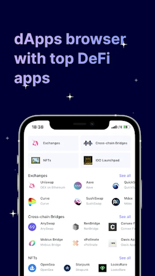In the wallet, you can create BTC Bitcoin wallet, ETH Ethereum wallet, AVAX Avalanche wallet, BSC Binance wallet, Tron TRX wallet as well as for tokens Tether USDT wallet, AAVE wallet, Safemoon wallet, ADA wallet, XMR wallet, Anchor wallet and other erc20 wallet, trc20 tron wallet, bep20 wallet, erc721 and erc1155 in your non-custodial crypto wallet. Store and send your assets and NFTs.