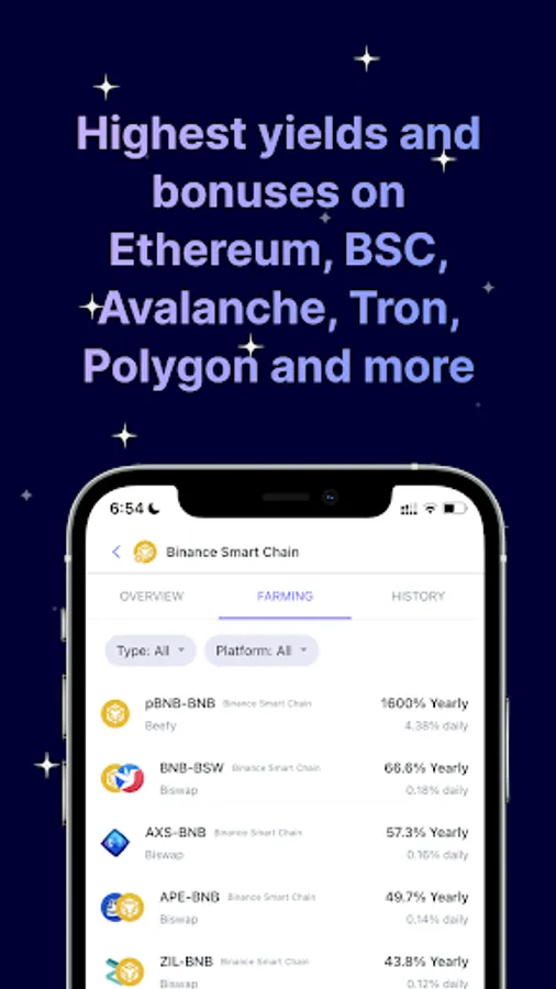 In our wallet, we can find the best staking and earning offers on the market, at the highest APY, including yield farming, staking, and liquidity offers.