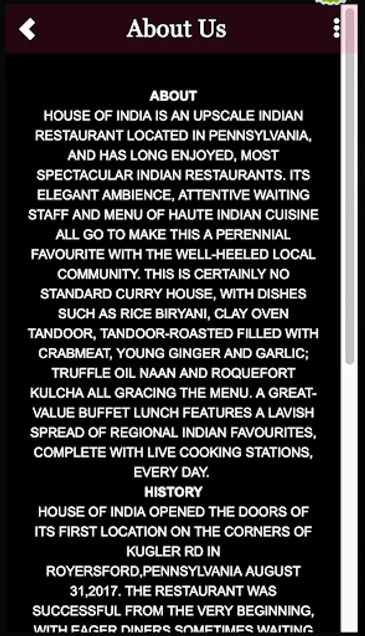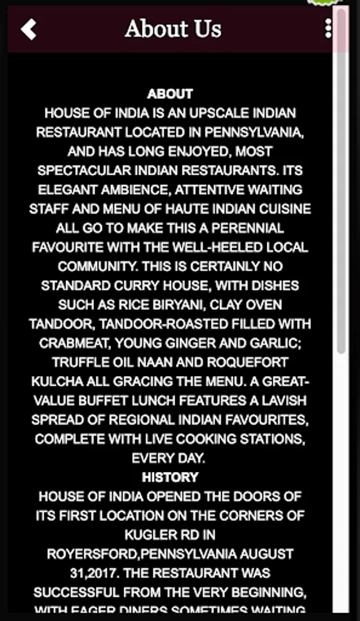 Indian Resturant located at 121 market st, collegeville PA, 19462. This app will give you information about us, our menu, you can order from it, pictures, our location, you can book your table from there directly, etc.