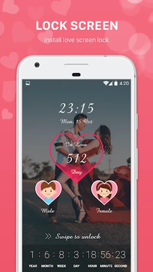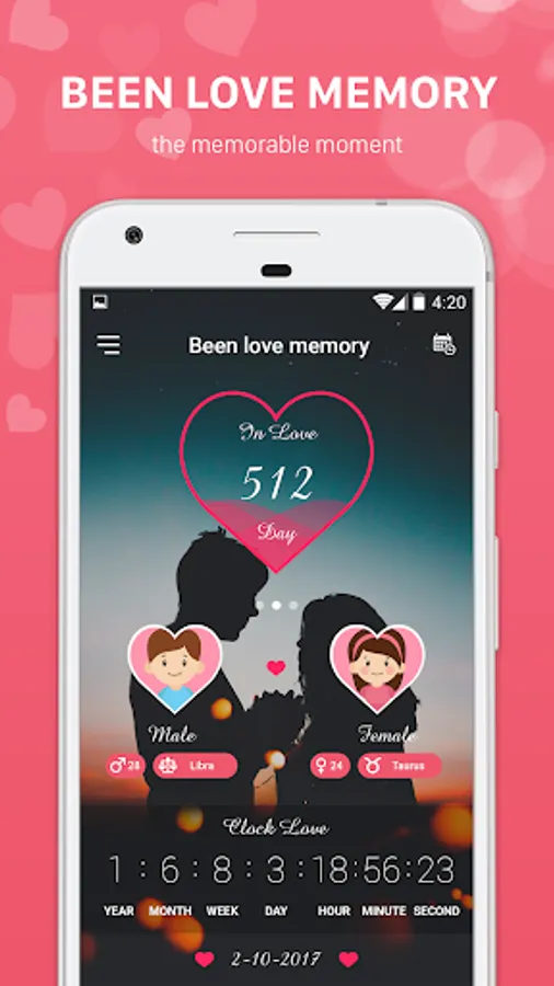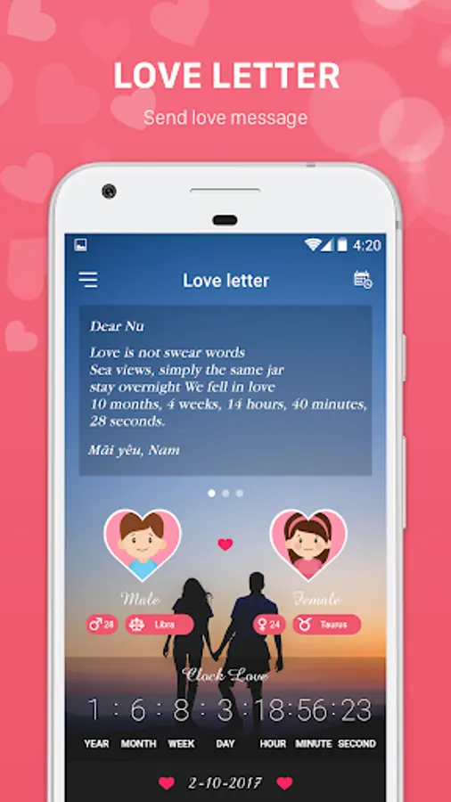 Love Days Counting - Love Diary 365: The app calculates the love time for couples and displays it on an extremely cute, romantic interface to help you warm up your love. Other special features such as love clock, love photo album, love letter, love diary, love sms, reminder of holidays, anniversary make application become a love handbook Missing for couples.