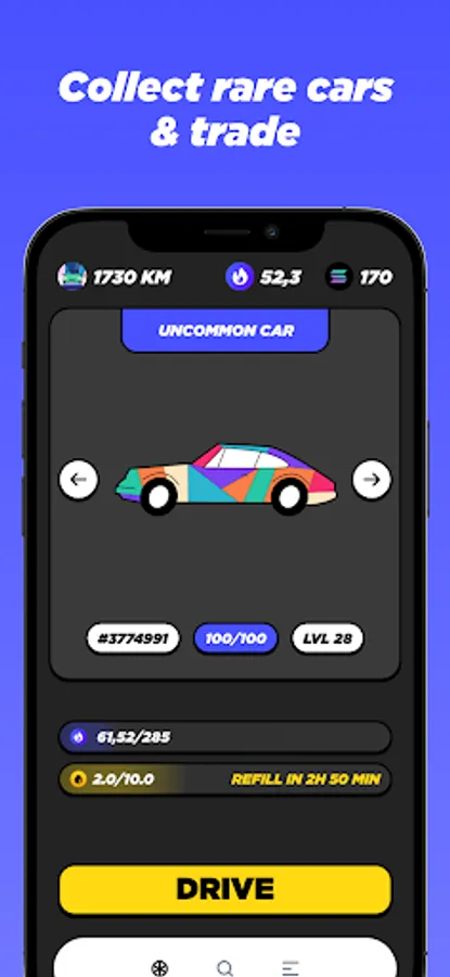 Start driving with NFT cars, and receive rewards in DRIVE. Purchase a car NFTs, that let you earn while you are driving.