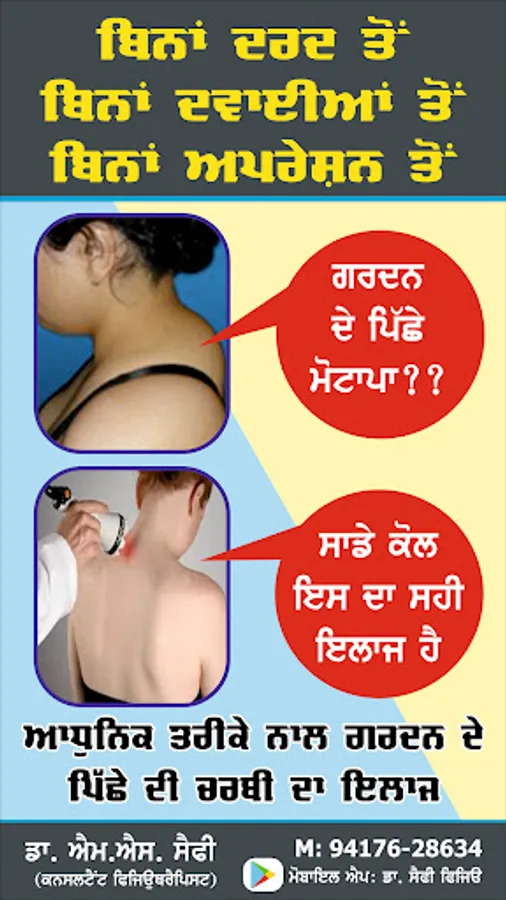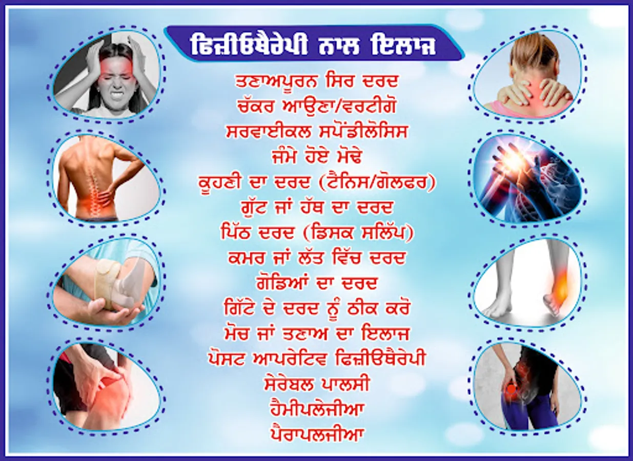 It is a well equipped set up of physiotherapy electronic modalities to serve people. It has Short wave diathermy, Imported Interferential therapy unit, Ultrasonic therapy unit, Electronic traction unit, Electrical stimulator, etc. We are the best clinic in Moga, Punjab, India. Approach for exercise therapy is also one of the best which includes Active movements, resisted exercises against weight and theraband, positional changes to improve strength, Active/passive stretches, yoga postures to improve flexibility. Maitland’s joint mobilization to improve joint ranges. Physiology of lung and respiratory system along with different breathing techniques. Patients with joint problems are given tips to avoid pains, ergonomics and postural correction along with exercises. Pregnant females are given detail explanation of pregnancy physiology, postural correction, breathing exercises for labour along with other exercises. Brain and paralytic patients are treated according to the individualized needs including hand activities and balacing exercises. We knows our social responsibility and gives free treatment to poor patients.