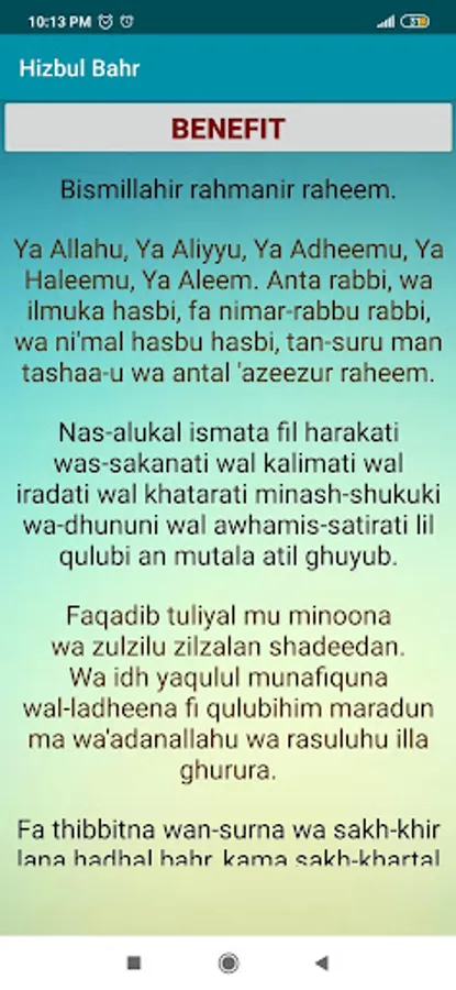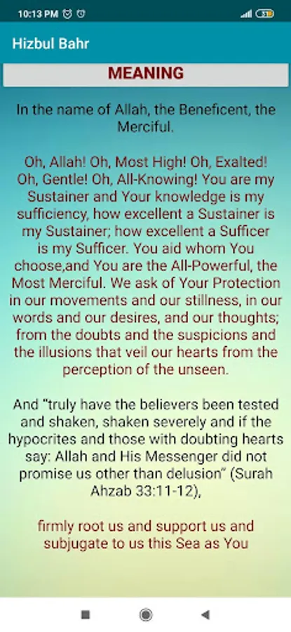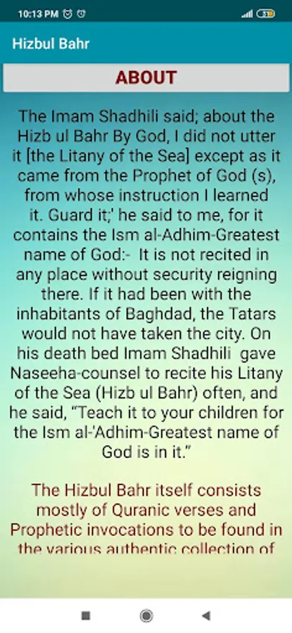 Shaykh ali abul hasan ash shadhuli, may Allah sanctify his secret, spoke of this hizb as, he was dying in the desert near humaythrain on his last hajj, he gathered all of the muridun, who were with him and told them, continue with the hizbul bahr & teach it to your children. It contain (al ism al azam) the greatest name of allah.
