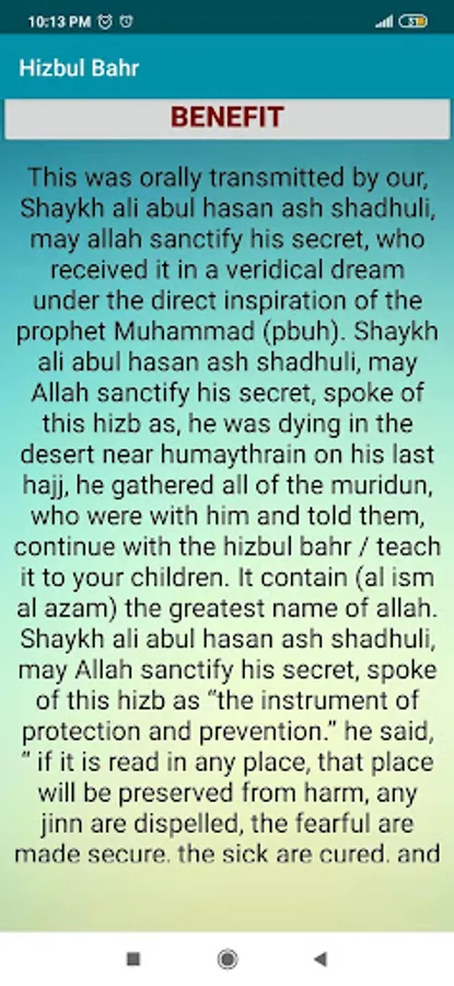 Shaykh ali abul hasan ash shadhuli, may Allah sanctify his secret, spoke of this hizb as “the instrument of protection and prevention.” he said, “ if it is read in any place, that place will be preserved from harm, any jinn are dispelled, the fearful are made secure, the sick are cured, and the anxious one is made peaceful.