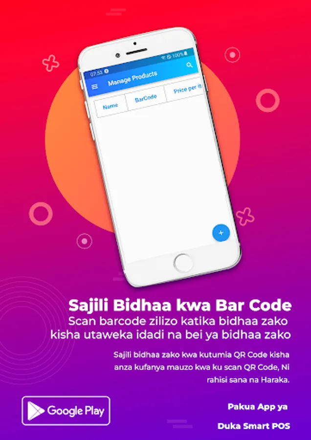 Sasa ni rahisi kuendesha biashara yako ukiwa na DUKA SMART POS App. App hii inakusaidia ku scan QR code na Bar code za bidhaa zako na kusajili katika mfumo. Kisha ukiwa unauza unakuwa una scan tu bidhaa unazouza. Pata repoti mbalimbali za biashara yako kiurahisi.